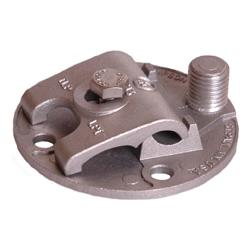 Premium die cast aluminum point base for top mounting at mechanical equipment, parapets or screen walls, etc. The bolt pressure cable clamp is for cables through No. A508. Base has an external stud for use with adapter type air terminals. The stud has 5/8 - 14 male threads. Mounting holes are 1/4" clearance.