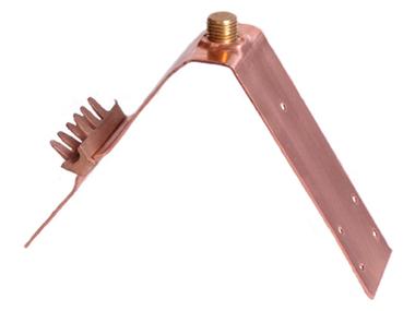 2" wide copper saddle with a cast crimp type cable connector for cables through No. 506. Stud with 5/8 - 14 threads accepts all adapter type air terminals. Adjustable to all roof pitches.