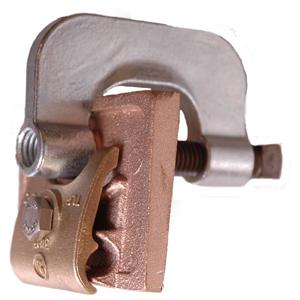Heavy duty forged steel "C" clamp with bronze bonding plate for cable No. 507 to structural steel purlins, channel iron, "I" beams, or angle irons. Has a premium die cast bolt pressure type cable clamp. Fits structural steel up to 1 1/2" thickness and has 9 square inches of bonding surface.