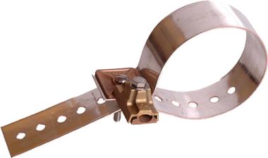 Adjustable 2" wide tinned copper bonding strap with a premium die cast pressure type cable connector for cables through No. 506. Fits pipe sizes 4" and O.D. sizes through 4 1/2". Longer straps can be furnished for larger pipes.