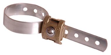 1" wide bonding strap of tinned copper with a premium die cast pressure type cable clamp for bonding to roof vents and piping, etc., up to 4" O.D. cable connector is for sizes through No. 507. (Not for use as main water service bond.) Longer straps can be furnished for larger pipes.