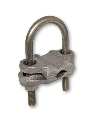U-bolt type pipe bonding clamp with aluminum cable connection and 5/16" stainless steel U-bolt. Accepts all cables through No. A507 and a maximum pipe O.D. of 1 7/16". Also used to support air terminals on vertical pipe masts or conduit mounted lights, etc.