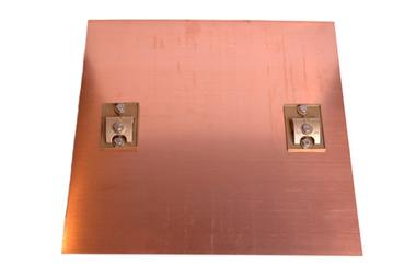Solid copper ground plate used where shallow or rocky topsoil conditions preclude the use of driven ground rods. This ground plate is 24" x 24" x 20 gauge thick and comes complete with two premium die cast bolt pressure type cable connections for cables through No. 506.