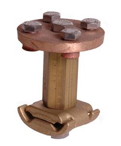 Embedded bus terminal outlet that may be installed flush in floor slab or wall. Lower clamp accepts cables up to No. 506. Top plate has smooth bronze surface with four 5/16" cap screws and one 3/8" cap screw. Up to four legs/terminals may be attached by using longer cap screws. This is an excellent fitting for grounding machinery.
