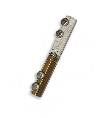 One piece heavy duty brass/aluminum splicer to join copper to aluminum cables. Cable size range up to No. 507/A507. When used as a bimetal transition at downlead locations, this clamp must be 18" minimum above grade. Stainless steel set screws have rounded ends that prevent cutting of cables when tightened.