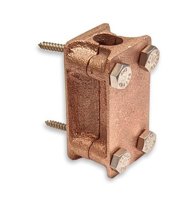 Overlay type ground test disconnector for use on wood walls. Comes complete with wood screws for mounting. Made of bronze for use with copper cables through No. 506.