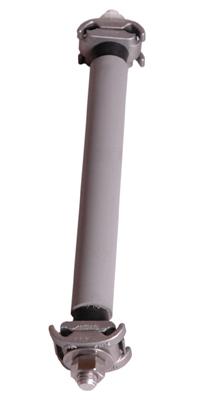 This through roof connector assembly is for use similar to the No. A156BT-4-24 except the riser passes through the roof deck with the downlead termination below the roof. The 1/2" diameter riser bar has an integral 1" PVC sleeve for use with boot type roof flashings. Riser bar length is 24". Premium die cast cable clamps at top and bottom are for cables through No. A508.